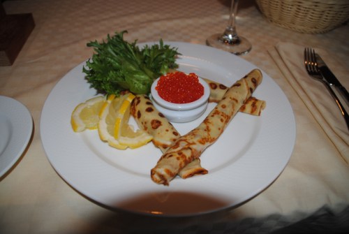 Denna kväll orkade jag bara proppa i mig två rätter. Det blev blini med röd caviar till förrätt och en kalv med svampsås. Till köttet fick man även något ryskt tunnbröd som var stekt. Jag är inte så van med ryska restauranger så jag förstod först efteråt att man även kunde beställa olika tillbehör till maten. Maten var god, men för det priset hade jag förväntat mig lite mer. 150 Euro gick notan på allt som allt för 3 personer.Men det var väl underhållning (en pianist och sångerska) i restaurangen som kostade.