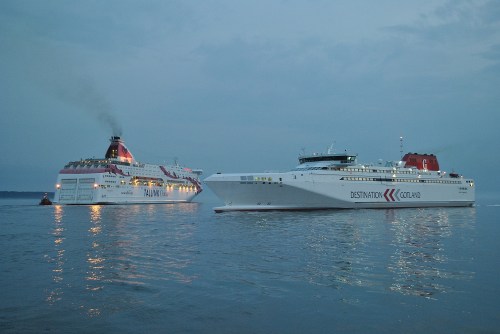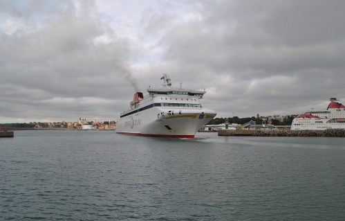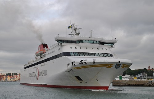 Gotlandia 2 paserar hamninloppet och svänger för att lägga till framför Gotlandia.