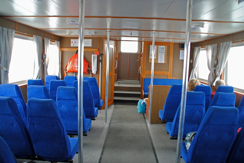 En interiörsbild från trevliga Stångskär. 68 passagerare kan man som mest ta ombord.