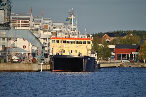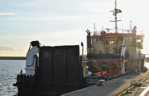 Här ligger Fyrbjörn vid kaj bredvid den gamla hamnkranen. Han har en ganska ovanlig design med sitt katamaranskrov.