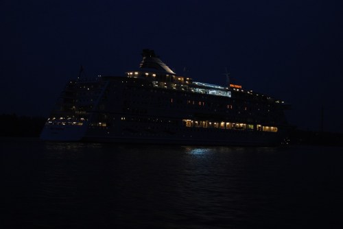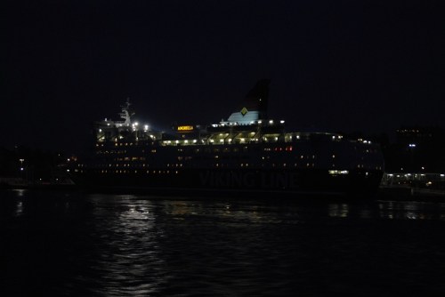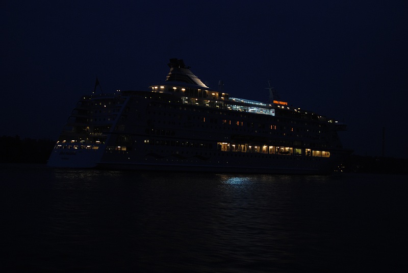 När vi kom ut från Skurusundet så kom Birka Paradise från stan. Nu hade det blivit rekoderligt mörkt.