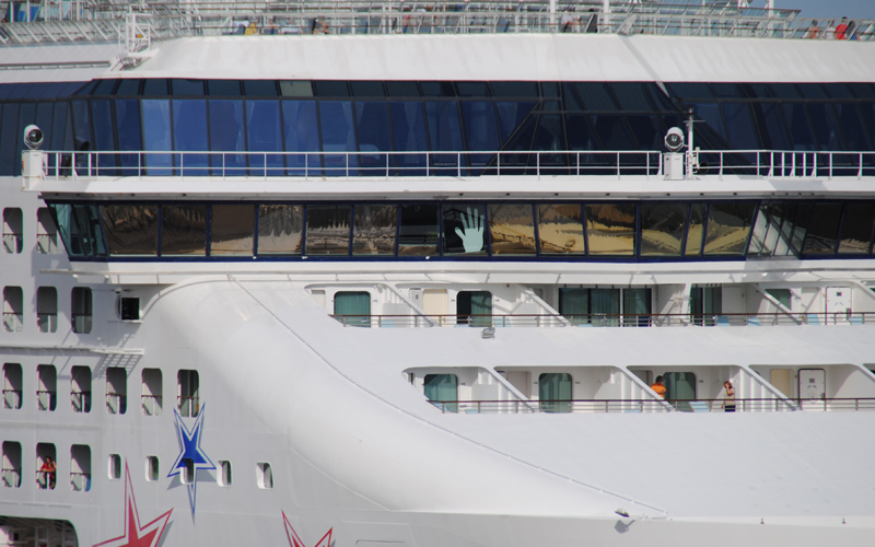 Hytterna i fören ombord på Norwegian Star ser inte så dumma ut. Lägg även märke till handen uppe på kommandobryggan.