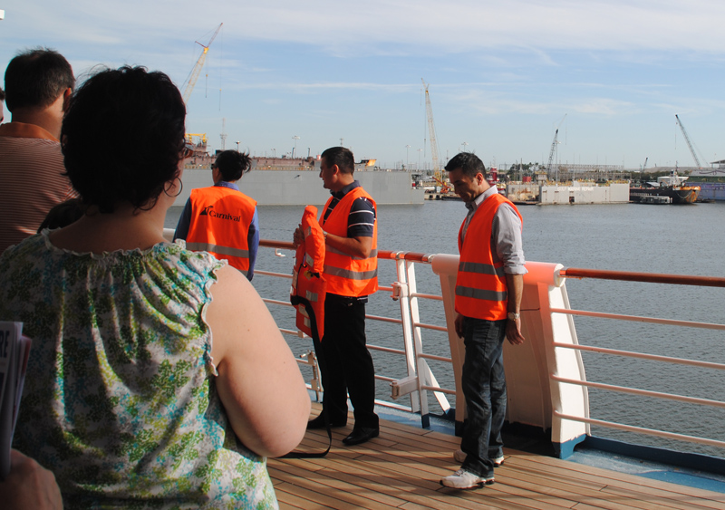 En timme innan avgång var det dags för säkerhetsövning. Alla passagerare fick bege sig till sin evakueringsstation. En besättningsman visade hur man satte på sig flytvästen och sen var det slut.