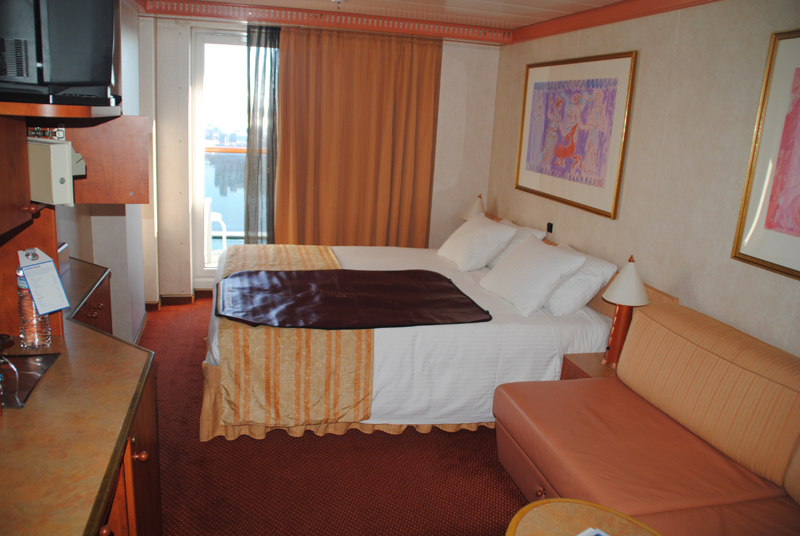 Efter lunchen var hytten färdig. Vi hade bokat balkonghytten 7302 i aktern på däck 7. Jag måste säga att jag var väldigt nöjd med läget på hytten, nästan inga vibrationer alls. Inredningen i hytten kändes lite enkel. Jag tycker fötsås inte om när det är fullt med olika färger i hytterna. Eftersom vi var tre personer i hytten så fick jag ligga i soffan. Den var dock lika skön som de vanliga sängarna. Badrummet var inte mycket större än på finlandsfärjorna, men det var otroligt fräscht. Så hytten uppfyllde alla förväntningar och var lagom stor för en veckas kryssning.