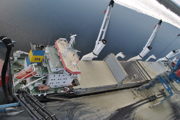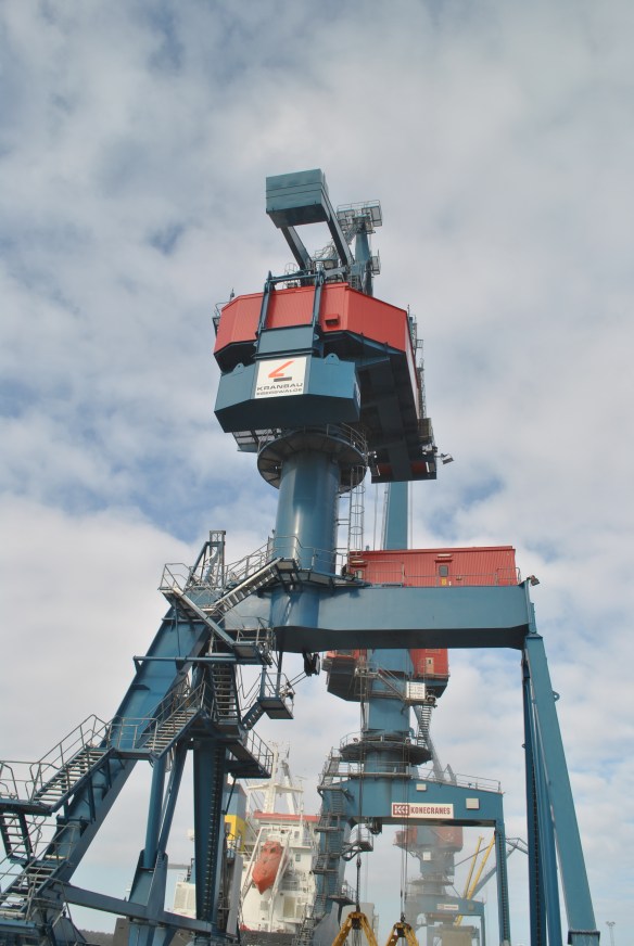 Dagen började med att jag fick följa med och smörja några gripar. Fick även åka lite Skylift och prova köra den. Efter det så var det dags för fikapaus. Efter fika pausen så var det dags för lite körlektion i kran 4. (Var mkt intressant att köra kranen). Sedan var det lunch. Efter lunchen så följde jag med upp i kran 1 där man lossade Bentonit från TransOsprey. (Bentoniten dammade nå jävulst, vilket ni kan se på bilderna) : Sedan så var det dags för lite äventyr i kran 2. Kranföraren Mats tog med mig allra högst upp i kranen, Kan säga att det var mkt spännande och utsikten var fantastisk. Efter det så följde jag med ut i soplastbilden. Fick även prova att köra den.
