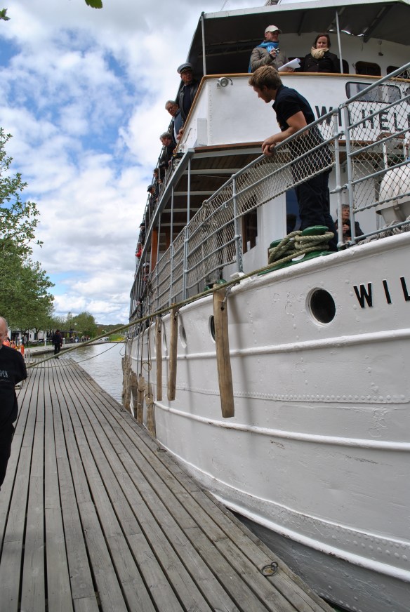 Kanalbåten Wilhelm Tham lägger till vid kanalkanten.