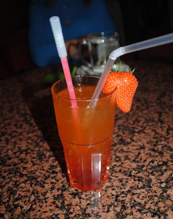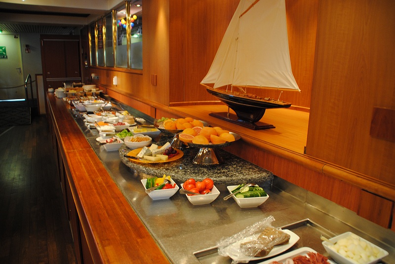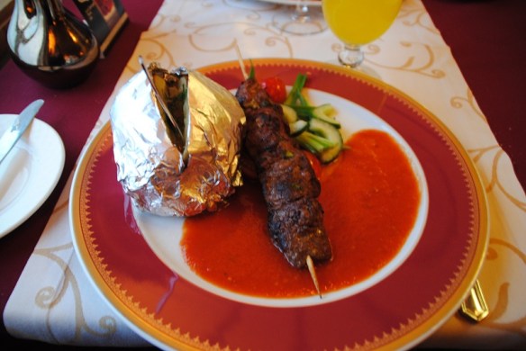 I restaurangen kunde man välja från den ordniarie menyn, Fiesta menyn och den ryska menyn. Jag åt en squashsoppa till förrätt och den var himmelskt god. Till varmrätt blev det lammspett med bakadpotatis och till efterrätt blev det cyrniki, ryska plättar. Allt smakade väldigt bra och service var på topp! (Även om inte servitörerna kunde svenska, men engelska var de duktiga på).