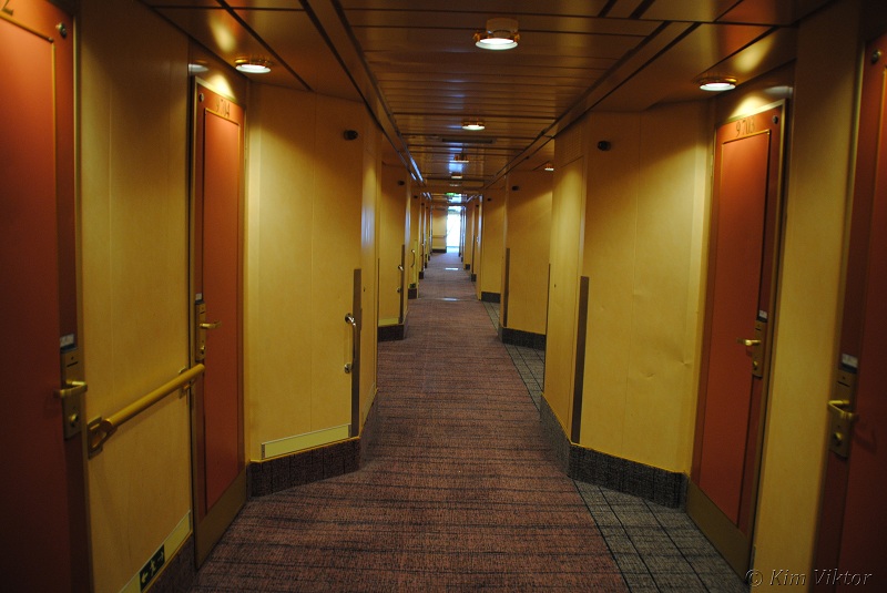 En bred hyttkorridor som ledde ut till soldäcket.