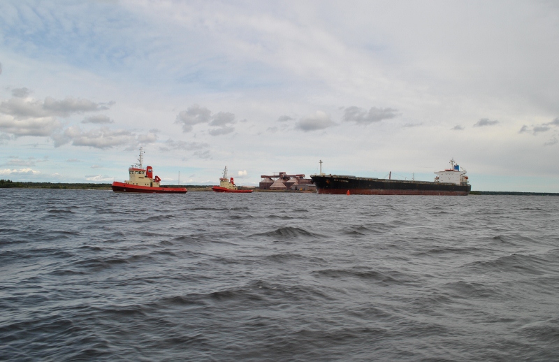 När vi bytt bränsleslang så fick vi igång motorn igen. På väg till hamnen i Lövskär, passerade vi detta Bulkfartyg som assisterades av alla tre bogserbåtar
