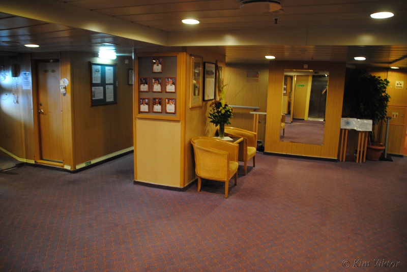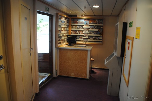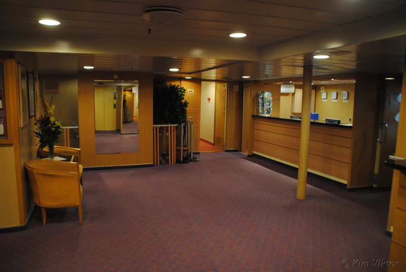 Går man upp ett däck så kommer man till receptionen och utflyktsdisken (längst akterut). Här sker även landstigningen både till tenderbåtar och direkt till kaj. Föröver ligger hytter.