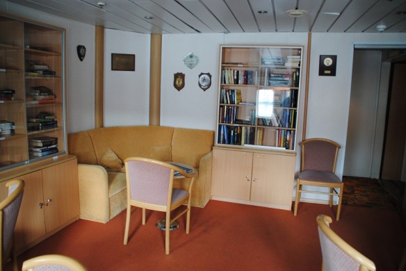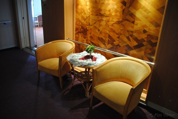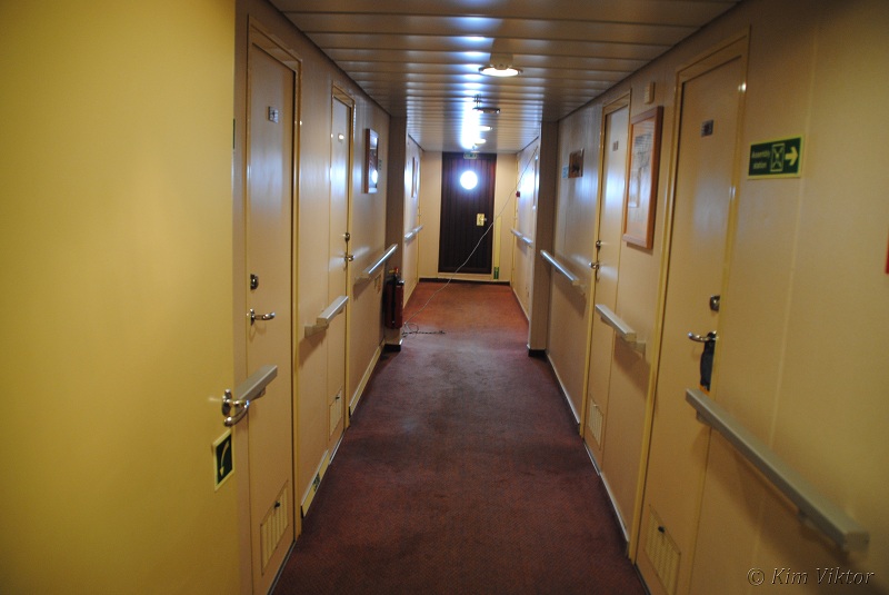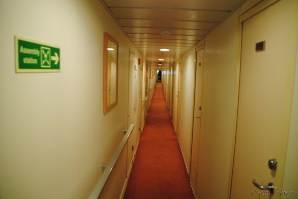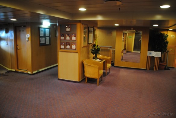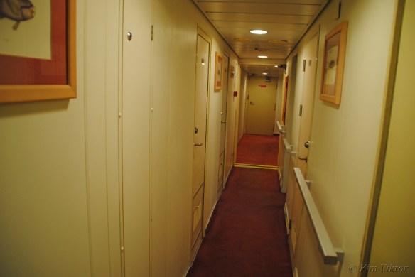 Ett däck högre upp, på Navigator deck ligger bryggan och andra besättningsutrymmen. Men längst akterut finns denna breda hyttkorridor där lyxhytterna ligger. Vissa hytter har begränsad utsikt p.g.a. livbåtarna som hänger utanför. Men den största skillnaden på en vanlig hytt och en lyxhytt är minibaren. Inget som jag skulle betala flera tusenlappar till för att få.