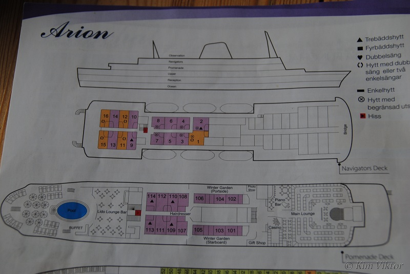 Vi börjar längst ner på Ocean deck. Här finns det hytter i kategori 2 (utsides) och sjukhuset ligger här. Vi bodde på detta däck i hytt 418.