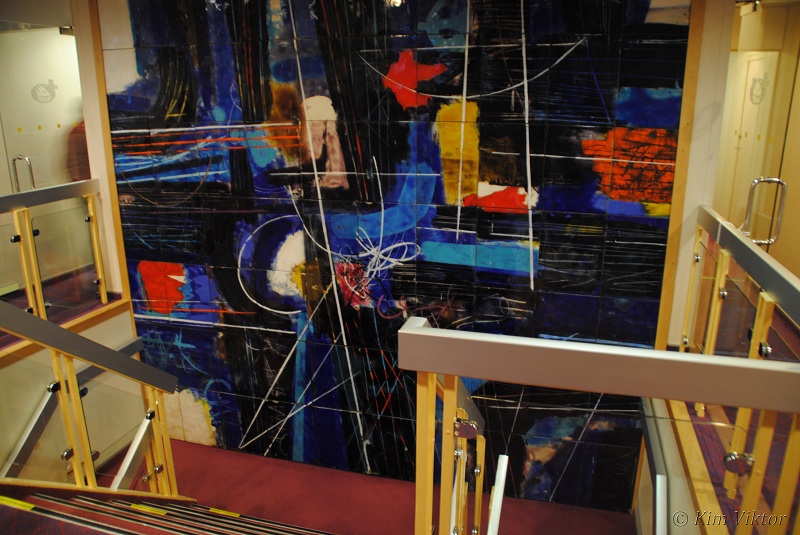 Lite konst i trappan. Lägg även märke till hur bred trappan är i fören jämfört med aktern.