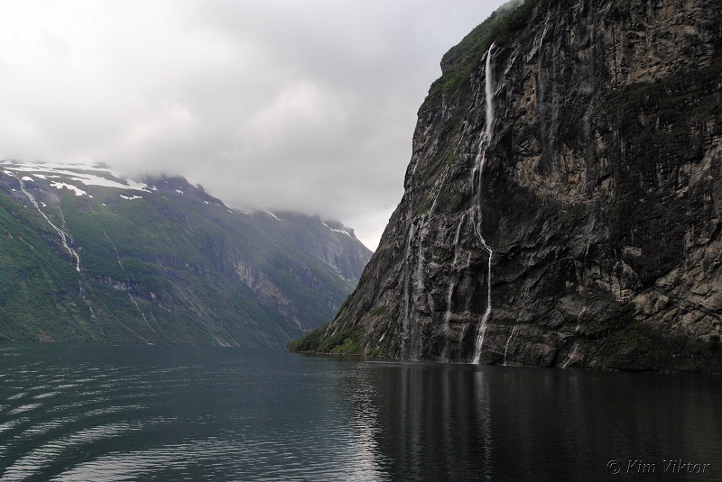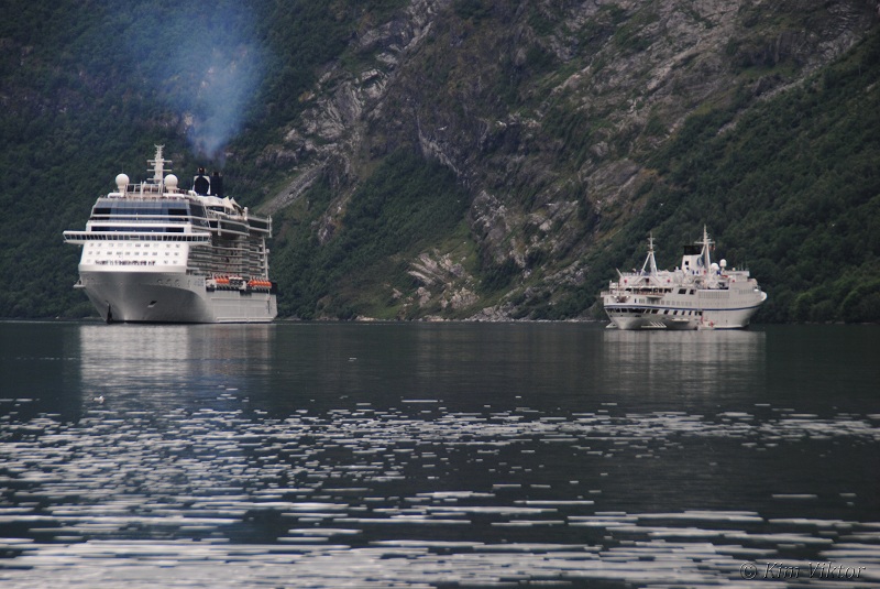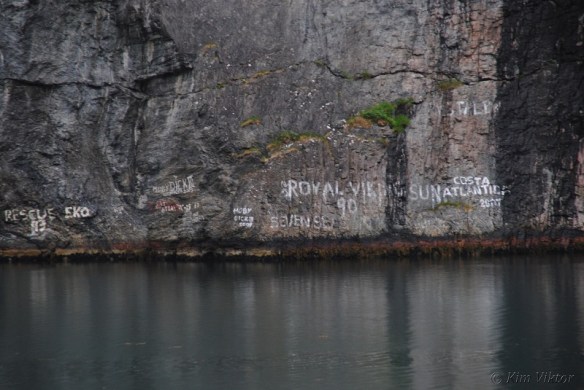En del fartyg som har besökt Geiranger har gjort avtryck på bergsväggen.