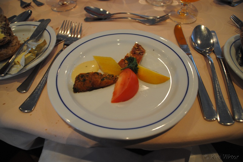Till middagen beställde jag rökt fisk, inte många bitar fisk fick man. Sen åt jag också Viltmästargryta och Peach Melba.
