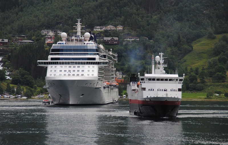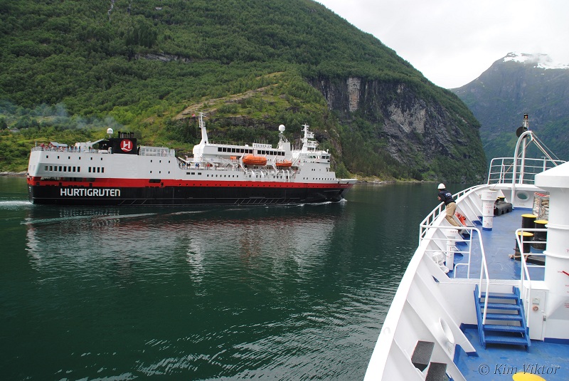 Hurtigrutens fartyg Vesterålen på ingående till Geiranger.