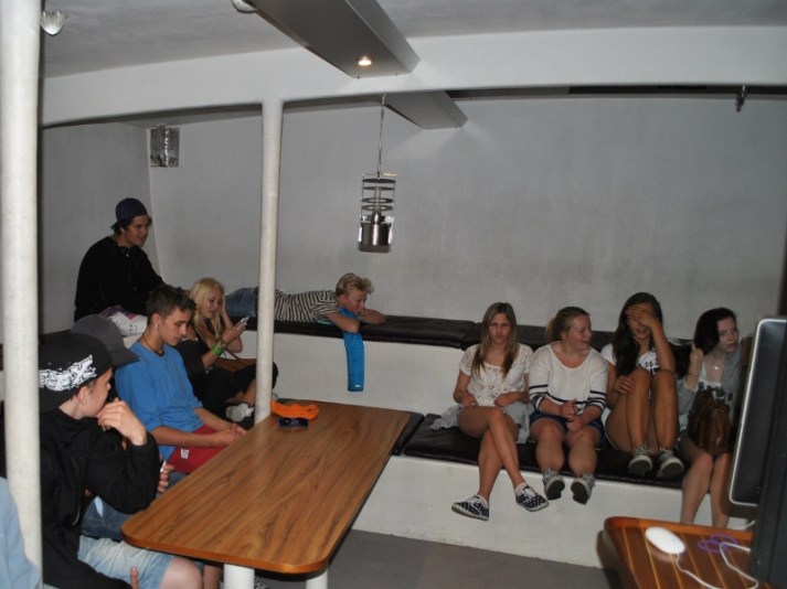 Eftersom vädret var så dåligt samlades alla i salongen där besättningen höll genomgång om regler osv.