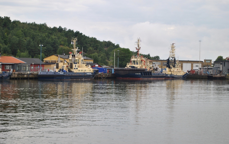 Nu har vi lämnat seglet och fortsätter ut ur Göteborg, (Bogserbåtarna Svitzer Gaia, Svitzer Trym och Lars.