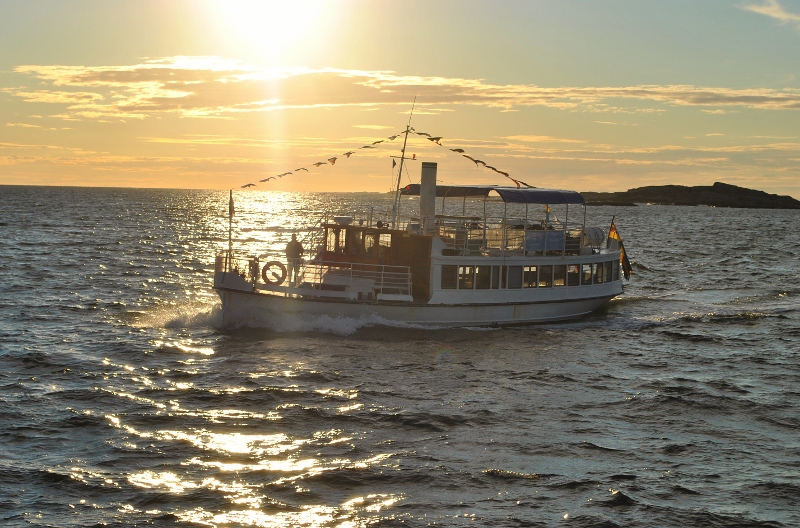 Den vackra ångbåten Svea af Bohuslän passerar i Solnedgången.