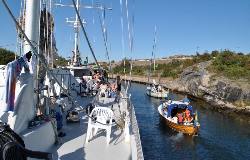 Det blir trångt i kanalen när vi seglar igenom med Elida.