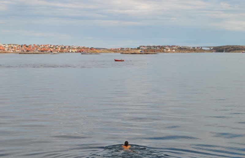 Ribb-båten sätt i sjön för att ta oss i land, men det visar sig att Daniel glömt att ta med startnyckeln. Så Nathalie får simma ut med den 😉