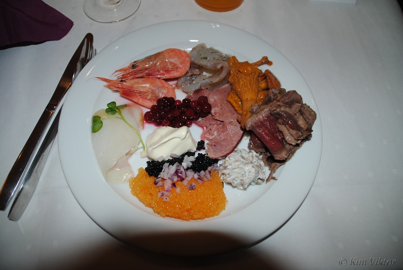 Som vanligt började vi med de kalla rätter utöver det vanliga utbudet på ett smörgåsbord, så fanns även viltprodukter som lättrökt hjort (godast av allt!), tjälknöl på älg, vildsvinsstek och syltade kantareller.