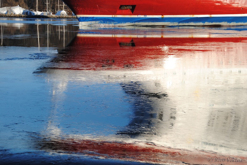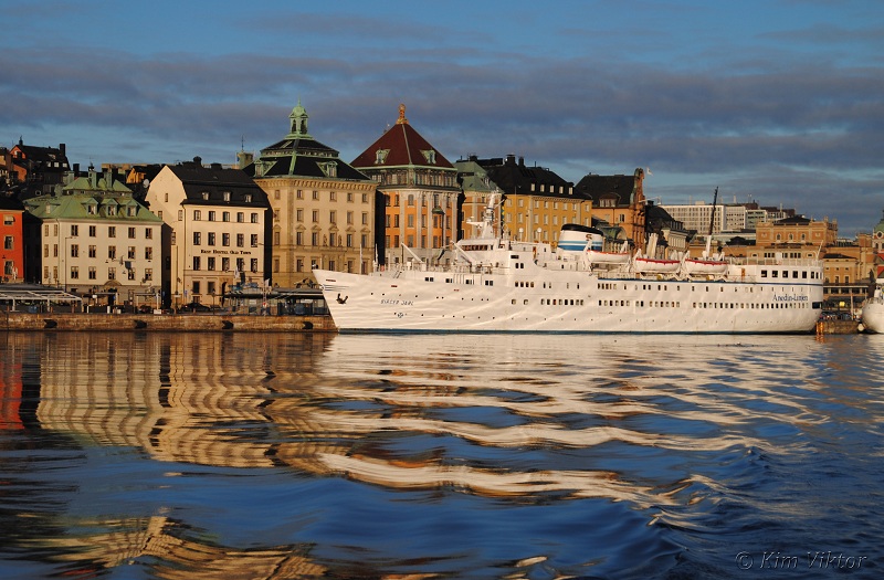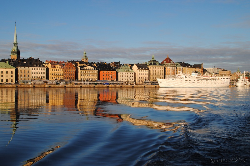 Resan skulle påbörjas vid Strömkajen, så jag gick längs Skeppsbron och njut av det vackra morgonljuset. På bilden syns Birger Jarl reflektion i vattnet.