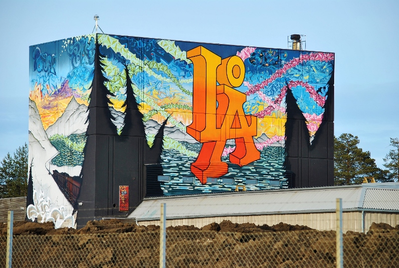 ett konstverk målat på en betongbyggnad vid reningsverket.