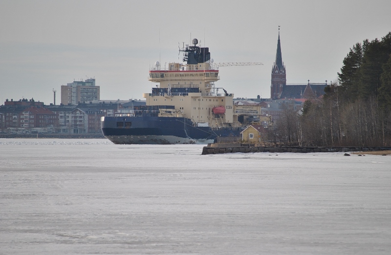 Oden ligger vid kajen i Luleå. Undrar om isbrytarsäsongen är över för han/hon.