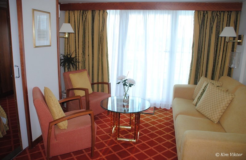 Vardagsrummet i en av de största sviterna ombord med två sovrum.