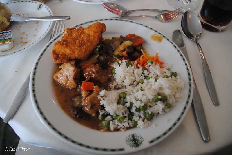 Dags för lunch! Man fick välja mellan att beställa från matsedel eller buffén. Eftersom det var i stort sett samma mat på båda, valde vi buffén. Maten var engelsk med friterad fisk och kokta grönsaker. Det smakade helt ok, men det var inte så många olika smaker om man säger så.