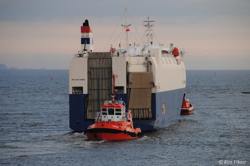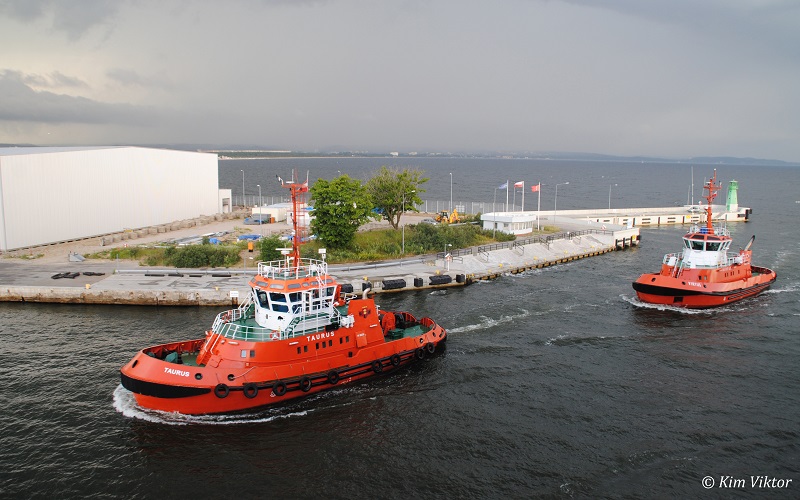 Bogserbåtarna Taurus och Virtus på ingående till hamnen efter att hjälpt City of St Petersburg ut på öppet hav.