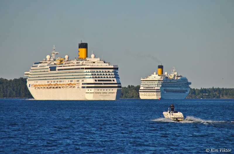 Det känns lite speciellt att se två så lika fartyg gå sida om sida ut genom skärgården.