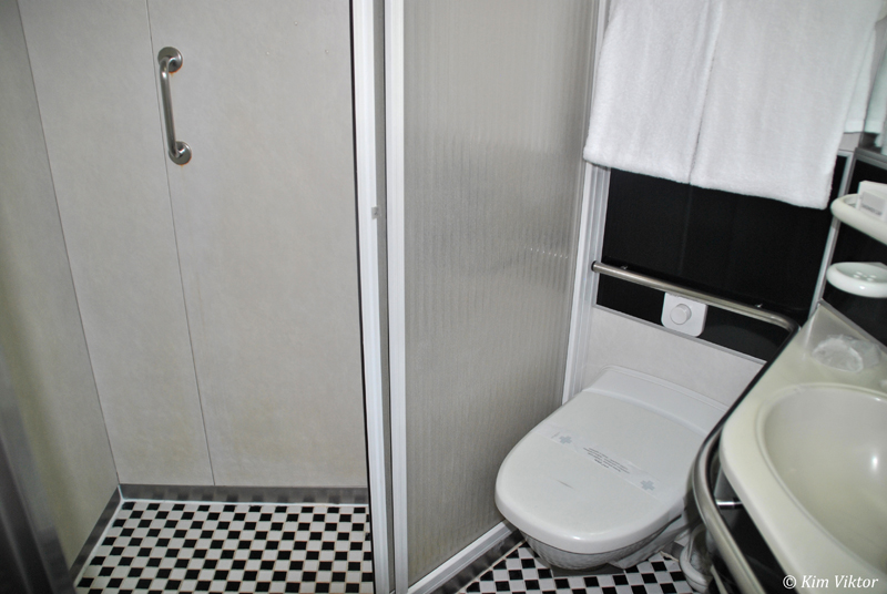 Fräscht badrum, de hade visst problem med toaletternas vakuumsystem ombord, så man var tvungen att slänga toalettpapper i papperskorgen istället.