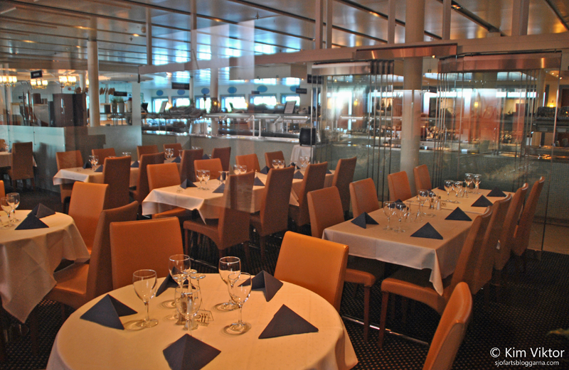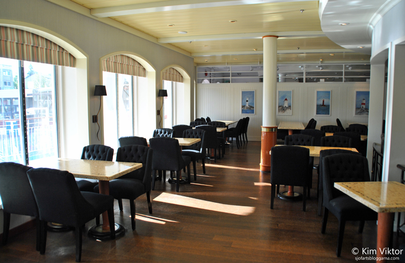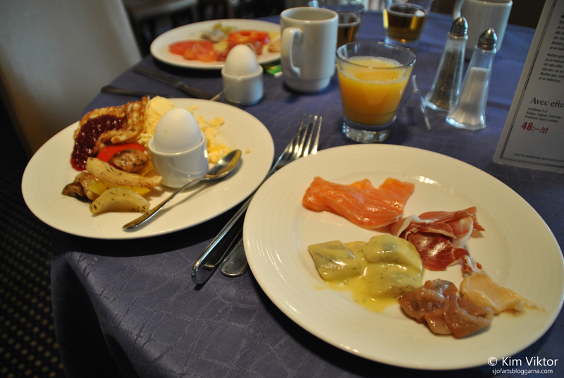 I Sjösalen serverades frukost. Jag måste tyvärr säga att det är nog Östersjöns tråkigaste bufférestaurang och den sämst planerade också. Direkt när man kommer in så måste man tränga sig förbi folk som står i kö för att ta mat eller kaffe. Vi hittade i alla fall ett lugnt bord längst in i restaurangen.
