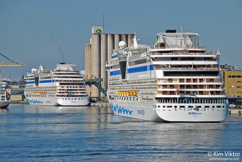 Först ut AIDAbella som närmast kom från Helsingfors. Det är på senare år som AIDA har haft två fartyg stationerade i Östersjön. AIDAbella går i år på 10-nätters från Warnemunde och AIDAmar på 7-nätters från samma hamn.