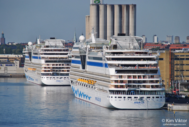 Vi börjar med det senaste, när AIDAbella och AIDAmar låg tillsammans i Frihamnen, den 24 juli. Men först en bild på Silja Serenade när hon passerade Larsberg.