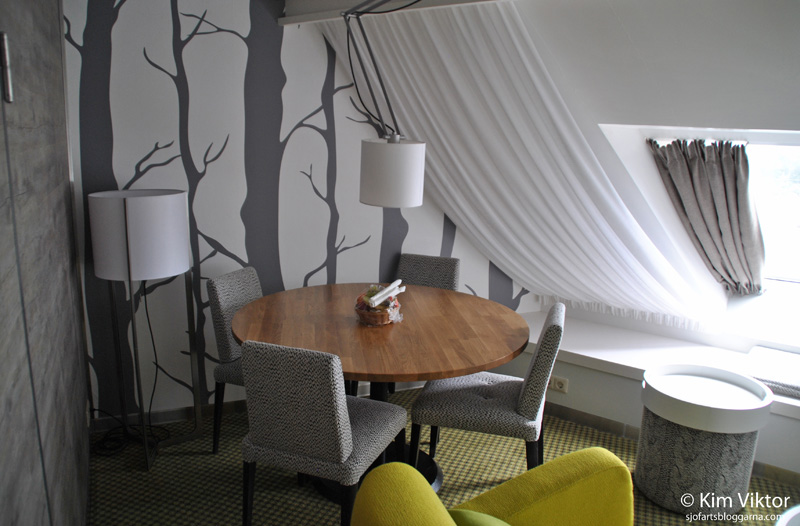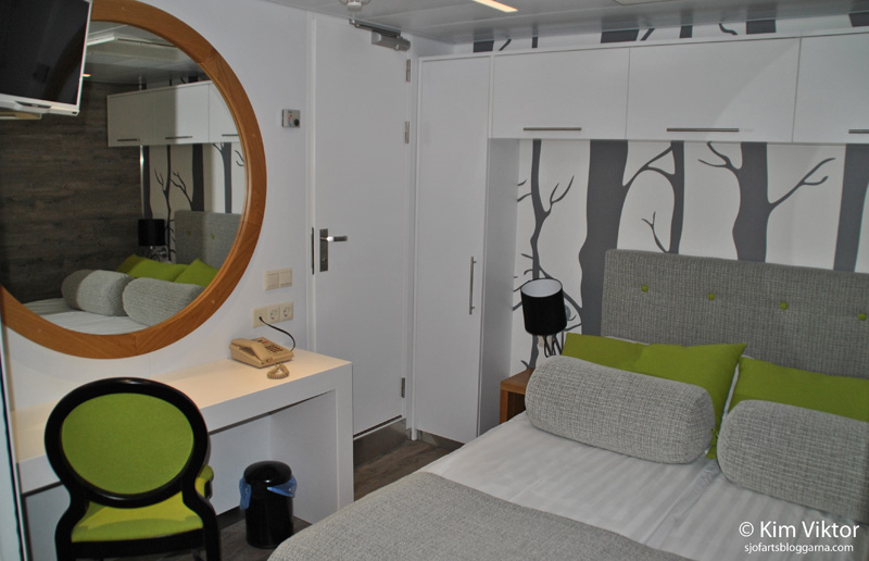 Vi sökte upp hytten på däck 9, en så kallad ”Junior suite”. Dessa sviter renoverades i vintras (tidigare konferenshytter), varje svit inspirerades av en årstid (vår,sommar eller höst). Vi fick den ”våriga” hytten. (Bilder på de andra två juniorsviterna kommer senare i reportaget).