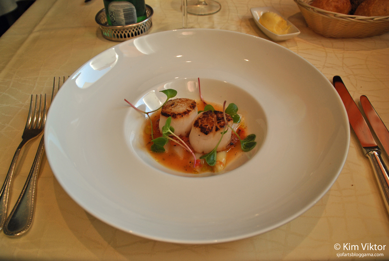 Klockan har hunnit bli 19 och middagen i Bon Vivant väntar på oss. Till förrätt beställde jag halstrade pilgrimsmusslor.