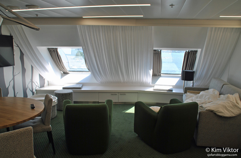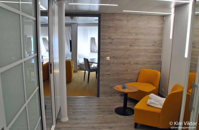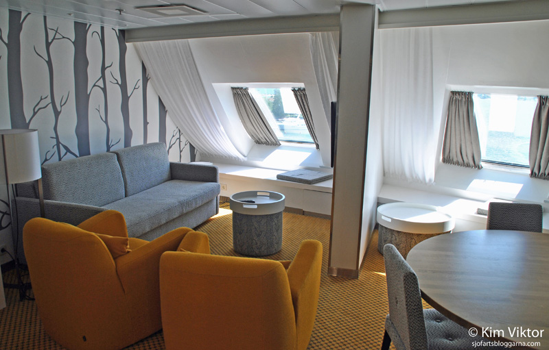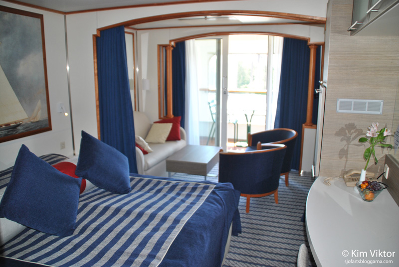 Fartyget höll på att städas när vi kom tillbaka, eftersom dörrarna till grannsviterna stod öppna, så tittade vi in. Här är sviten med hösttema.