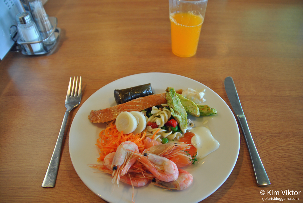 Buffén var fräsch med många olika rätter. Eftersom det var Tallink trodde jag inte att drickan ingick, men det gjorde, fast man fick bara plastglas…