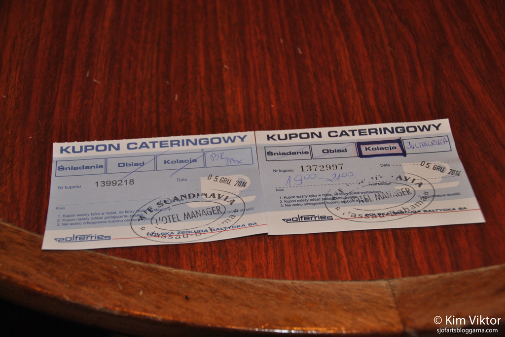 Eftersom denna kryssning var en ”speciell” julkryssning så ingick frukost och middag i vår biljett. I informationen fick vi ut dessa måltidskuponger. Dock så fick man gissa till när man skulle använda dem då det bara stod på polska. 😉