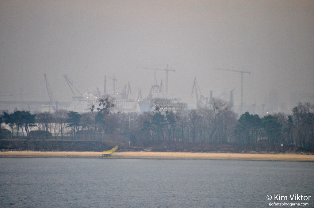 Bort i fjärran syns Finnmaid som ligger på varv.