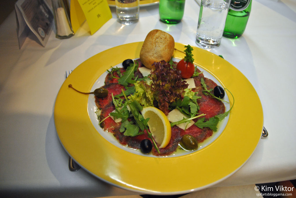 Dags för middag nummer 2, som även den ingick i priset och var en färdigkomponerad trerättersmeny. Som ni ser var det först carpaccio.