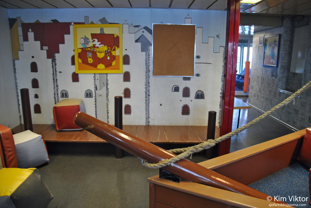 Uppe på däck 9 strax akterom skorstenen hittar man vilstolar och det stora lekrummet.