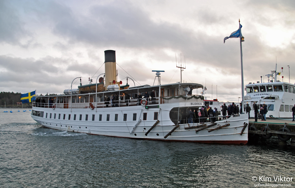 Fullt med folk som ska besöka julmarknaden. Eftersom det var lågt vattenstånd i Baggenstäket gick Blidösund från Björvik (Ingarö) istället för Stockholm.