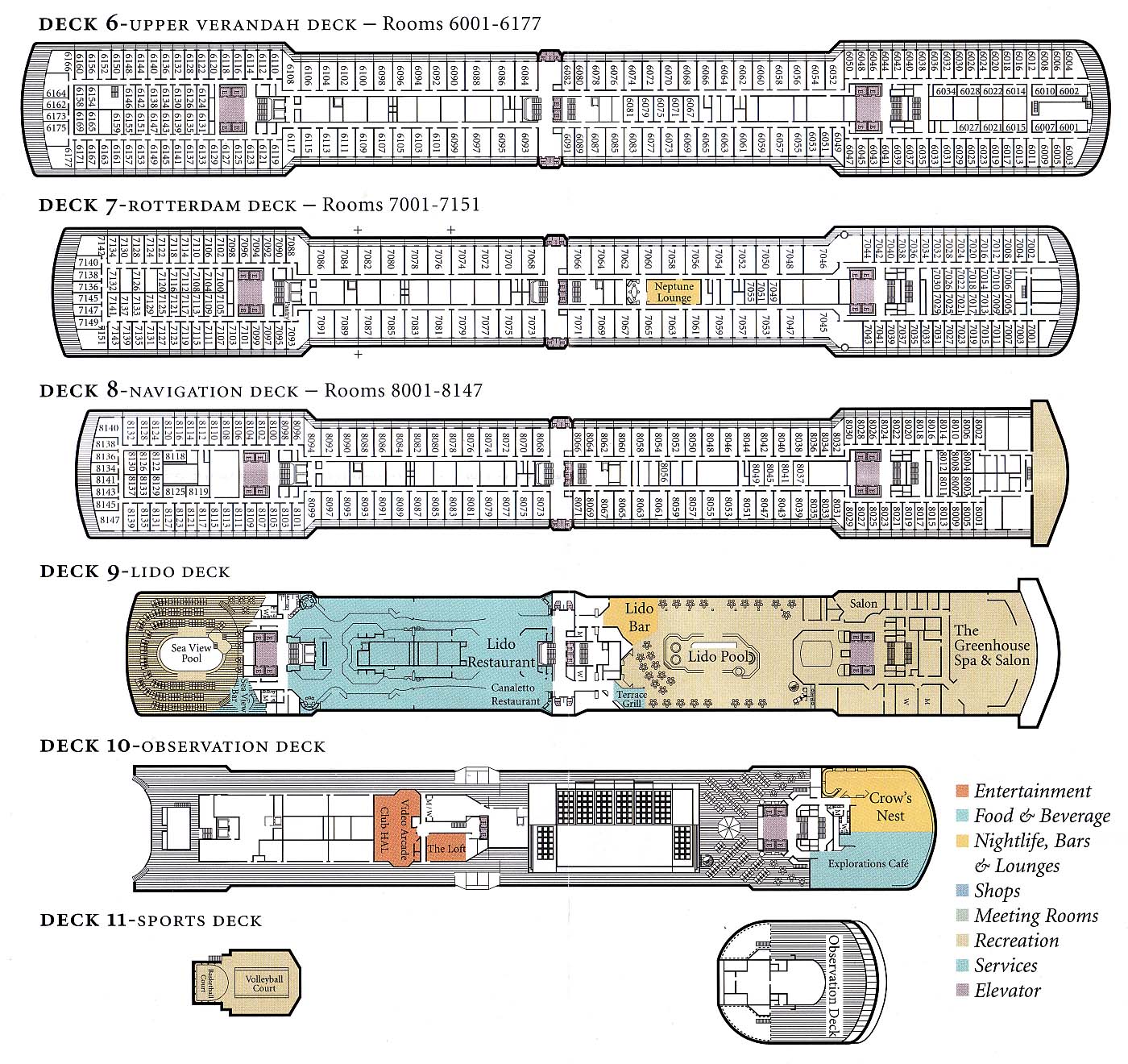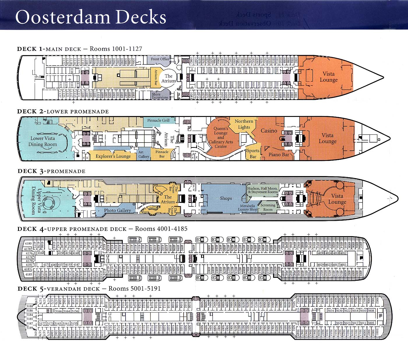 Oosterdams däcksplan, copyright Holland America Line. Fartyget har nio olika passagerardäck och totalt 924 hytter. Ifall ni inte vill se inredningsbilder så föreslår jag att ni blundar eller bläddrar förbi de kommande 50 bilderna. Eftersom det inte ska bli allt för många inredningsbilder på en gång, så har jag valt att dela upp dem. Därför kommer bilder från däck 1-3 nu och från de högre däcken i en senare del, nämligen nästa del.