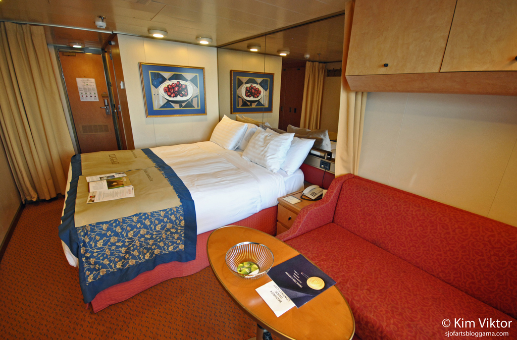 Vi var tre personer så en person (d.v.s. jag!) fick sova i bäddsoffan som de gjorde iordning varje kväll. Hytten var fräsch, kanske något trång för tre personer, men det fanns bra med bagageutrymme som gjorde livet enklare.