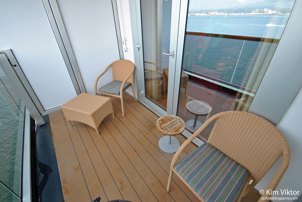 Var börjar man med om inte med hytten. Vi hade beställt en ”Verandah class”, som det så fint hette. Vår hytt 6016 låg långt fram i fören.