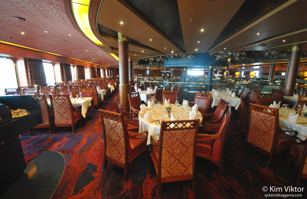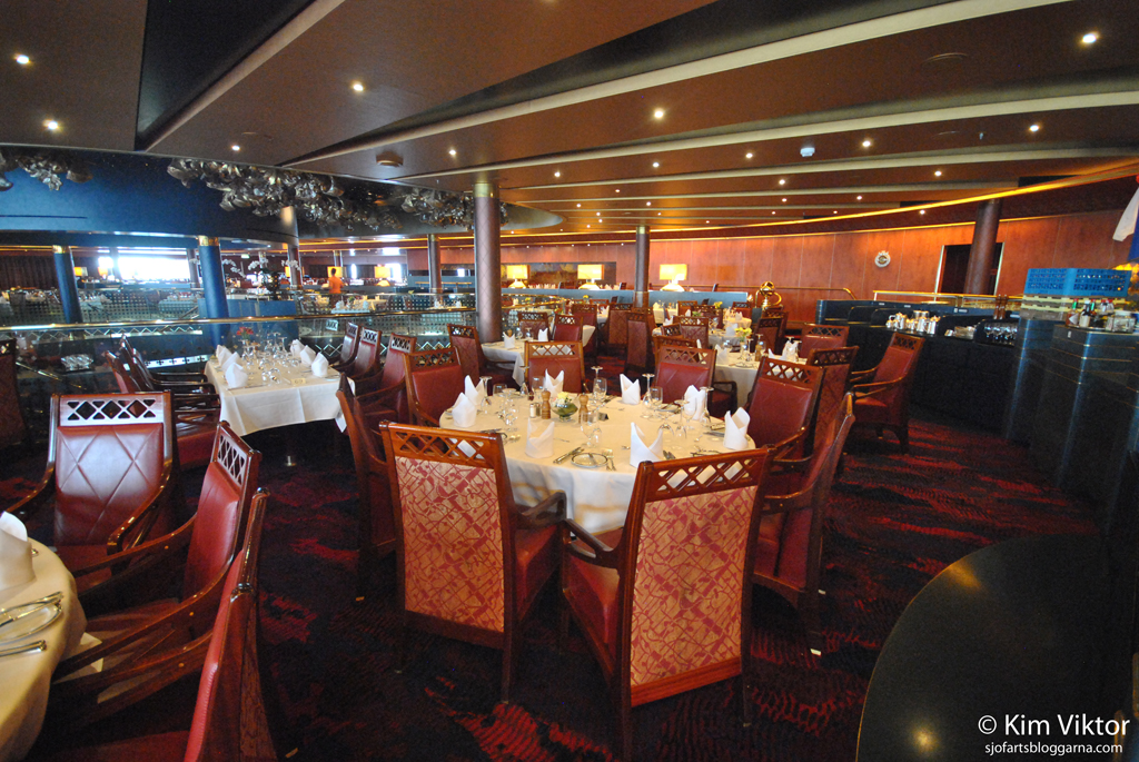 Vi hade bokat öppen sittning och kunde alltså gå och äta när vi ville mellan cirka 17.30-21. Huvuddelen av resenärerna hade visst valt öppen sittning, då man använde det lägre däcket (med fler sittplatser) för detta ändamål. De som hade valt att äta på en specifik sittning (vid samma bord varje dag), antingen klockan 17.30 eller 20.00 placerades på det övre däcket. När man kom till restaurangen frågade de alltid om man vill sitta själv eller dela bordet med något annat sällskap. Oftast kunde vi få ett bord direkt när vi kom dit (oavsett tid), de få gånger vi fick vänta lite, så fick man en sändare (eller vad det nu kallas) som började pipa när ett bord var ledigt.